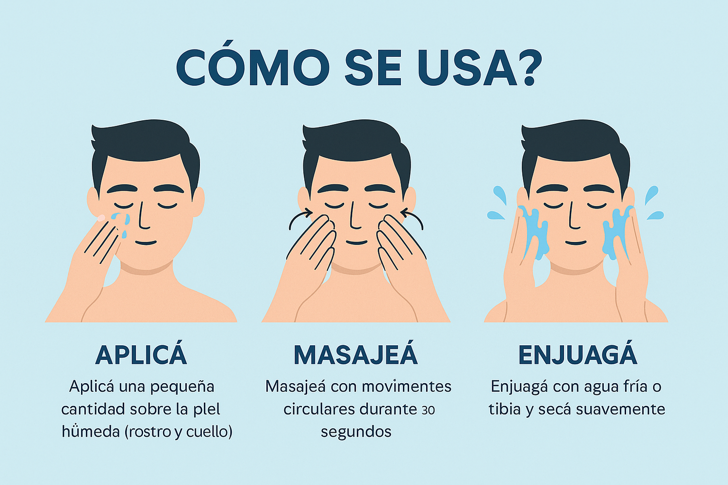 - Aplica una pequeña cantidad sobre la piel húmeda (rostro y cuello)